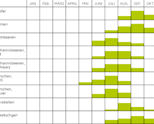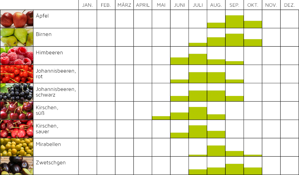 Hierzu zählen Äpfel, Birnen, Mirabellen, Kirschen, Sauerkirschen, Himbeeren, Zwetschgen, Johannisbeeren, Rhabarber, …………